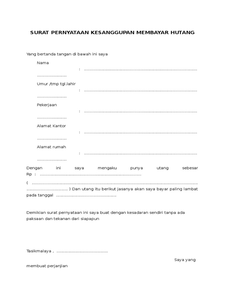 Sebelum kami memberikan contoh surat pernyataan kesanggupan membayar hutang, kami ingin membahas sedikit tentang pengertian atau definisi hutang. Surat pernyataan dibutuhkan dalam melamar pekerjaan, karier, pernikahan. Bagi sebuah instansi baik pemerintahan maupun swasta, suatu pernyataan akan lebih baik disampaikan secara tulisan daripada hanya sebatas lisan. Lihat 5 contoh surat pernyataan kesanggupan untuk memberikan kepercayaan bagi pihak yang bersangkutan dan berlaku di indonesia dengan berbagai tujuan dan manfaat diartikel ini. Apa pun jenisnya dan formatnya, surat pernyataan harus memuat identitas diri yang jelas dari si anda harus menyatakan kesanggupan dan kesiapan untuk meninggalkan jabatan lama dan menjalankan pekerjaan di jabatan yang baru.